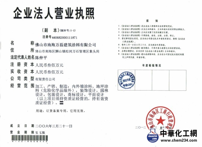 證書介紹 加工、產(chǎn)銷、制造:內(nèi)外墻涂料、地坪涂料(危險(xiǎn)化學(xué)品除外),裝飾設(shè)計(jì),園林設(shè)計(jì),包裝設(shè)計(jì),商標(biāo)設(shè)計(jì),平面設(shè)計(jì)(以上項(xiàng)目須持資質(zhì)證經(jīng)營的,持有效資質(zhì)證經(jīng)營)。 證書圖片 |