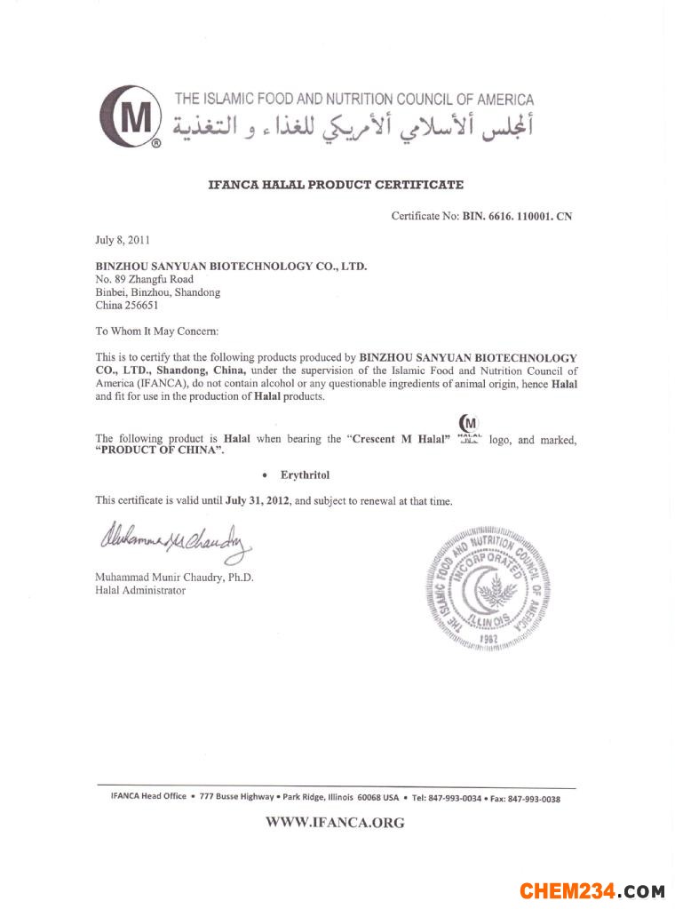 濱州三元生物科技有限公司的HALAL清真國際認證