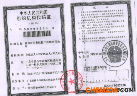 證書介紹 佛山市恒奧佳化工機械有限公司是一家專門從事精細化工、輕工、粘膠、塑膠、制藥和干燥等生產(chǎn)設(shè)備及配套產(chǎn)品設(shè)計、制造、安裝的專業(yè)性公司。公司經(jīng)過多年的不斷發(fā)展,現(xiàn)已擁有一批經(jīng)驗豐富的產(chǎn)品制造和技術(shù)開發(fā)人才。為公司生產(chǎn)高品質(zhì)的產(chǎn)品和持續(xù)發(fā)展奠定了堅實的基礎(chǔ)。公司不斷吸收及引進國內(nèi)外先進的技術(shù),開發(fā)出多品種,高技術(shù)先進實用的化工生產(chǎn)設(shè)備,并能為用戶提供整套先進的自動化生產(chǎn)線。