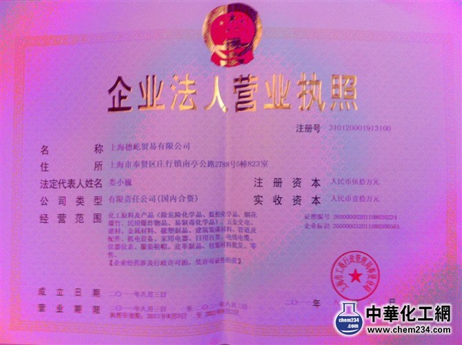 證書介紹 上海德屹貿(mào)易有限公司是一家專業(yè)從事化工產(chǎn)品進出口的貿(mào)易公司,本公司具有豐富經(jīng)營進口化工產(chǎn)品的經(jīng)驗,與眾多的國內(nèi)廠商建立了良好的合作關系,建立了穩(wěn)定的業(yè)務往來。產(chǎn)品涉及醫(yī)藥保健、化工、農(nóng)藥店、食品等行業(yè),具體的產(chǎn)品包括:有機化工原料,醫(yī)藥原料,食品/飼料添加劑,醫(yī)藥中間體,農(nóng)藥中間體,染料中間體,涂料、油墨、塑膠,以及其它精細化工有機合成中間體。