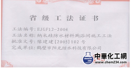 發(fā)明專利產(chǎn)品“納米硅防水劑”(專利號(hào)ZL 03126266·X)02年被評(píng)審為河南省高新技術(shù)產(chǎn)品,04年列入河南省火炬計(jì)劃項(xiàng)目,05年榮獲國家發(fā)明專利證書;“納米硅瞬間堵漏劑”04年通過省級(jí)專家鑒定,評(píng)審為“國內(nèi)領(lǐng)先”水平,06年被評(píng)審為河南省高新技術(shù)產(chǎn)品,07年榮獲河南省建設(shè)廳科技進(jìn)步獎(jiǎng),并被列入07年度河南省科技成果轉(zhuǎn)化項(xiàng)目,07年公司順利通過ISO9001-2000國際質(zhì)量體系認(rèn)證。UEA低堿膨脹劑、有機(jī)硅防水劑、鋁鹽防水劑、納米硅防水膠、JS復(fù)合防水涂料、自愈合防水密封膠、納米硅抗?jié)B堵漏劑、水泥養(yǎng)護(hù)劑等產(chǎn)品深受用戶的好評(píng)。