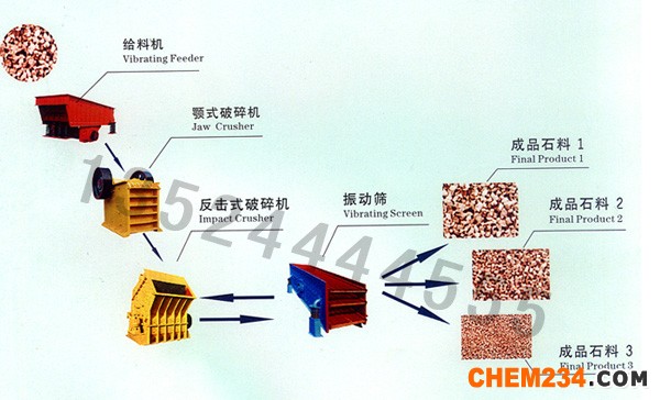石料生產(chǎn)線的流程大致為:(料倉) ---- 給料機(jī) ---- 鄂式破碎機(jī) ---- 反擊式破碎機(jī) ---- 振動篩 ---- (可成成品)。其中間的機(jī)器之間可用輸送機(jī)相接。詳細(xì)訪問http://www.mgpsj.com
