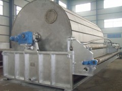 折帶式轉鼓真空過濾機工作原理與刮刀式其本相同,不同僅是濾渣卸除的方式為折帶卸渣,因此折帶式轉鼓真空過濾機的濾布是曲折的繞裝于轉鼓和各滾軸間。對細黏物料的過濾效果較好。而刮刀式過濾機過濾細黏物料時,存在著卸料困難、透氣性差、濾布易堵塞、濾餅水分高、生產能力低等缺點。由于折帶式過濾機改變了卸料方式、加強了對濾布的清洗,便基本上克服了這些缺點。當濾餅經過真空區以后,濾布就由一套輥子引出筒外進行卸料和清洗,清洗好的濾布再回到筒體重新工作。 折帶式真空過濾機不采用鼓風機卸料,而是讓濾布繞過卸料輥,通過變化曲率使濾餅自動落下,也可以利用刮板等機構幫助卸料。這樣卸料不僅提高了過濾能力,而且不用鼓風,使濾餅不致因回水而增加水分。折帶式過濾機將濾布引到筒體以外,有足夠的時間采用有效的方法清洗濾布。一般用壓力水沖濾布的兩面,還可根據需要用劇子和打布器等裝置進行更徹底的清洗,以保證濾布的透氣性。 折帶式真空過濾機適用于細、黏物料的脫水,廣泛用來過濾浮洗后的有色金屬精礦和煤的浮洗產品及處理污水。