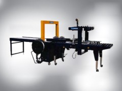 該打包機自動封箱,自動捆扎,光電感應,精確無誤,自動輸送,自動轉向,可調節打包距離。