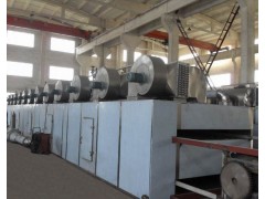 物料由加料器均勻地鋪在網帶上,網帶一般采用12-60目不銹鋼絲網,由傳動裝置拖動在干燥機內移動。干燥機由若干單元組成,每一單元熱風獨立循環,部分尾氣由專門排濕風機排出,廢氣由調節閥控制,熱氣由下往上或由上往下穿過鋪滿物料的網帶完成熱量與質量傳遞的進程,帶走物料水份。網帶緩慢移動,運行速度可根據物料溫度自由調節,干燥后的成品連續落入收料器中。上下循環單元根據用戶需要可靈活配備,單元數量亦可根據需要選取。