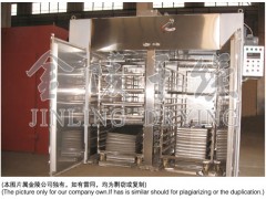 原理:本產品經過幾次升級換代,達到國內外先進水平。它是利用蒸汽或電為熱源,用軸流風機與熱交換器以對流的方式加熱空氣。熱空氣流經烘盤與物料進行熱傳遞。新鮮空氣從進風口進入烘箱進行補充,再從排濕口排出,不斷的補充新鮮空氣與不斷的排出濕熱空氣,這樣來保持烘箱內適當的相對濕度。本烘箱最大的特點是大部分熱風在箱內進行循環從而增加了傳熱,節約了能源。使烘箱的熱效率從傳統烘房的3%~8%提高到目前的35%~50%左右,它是利用強制通風的作用,減少上下溫差。我廠出廠的烘箱,均設有分風裝置,用戶可在使用前進行風葉調節,使上下溫差處于最佳狀態。系列烘箱不帶自動控制,采用4-72離心風機,CT-C型系列烘箱全部采用低噪音軸流風機,配用了自動恒溫控制系統,并備有PLC控制系統選擇。