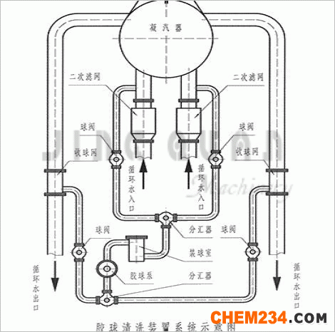 凝汽器膠球清洗裝置由收球網,膠球輸送泵,裝球室,控制器,膠球及閥門管路等部件組成。它借助水流的作用將大于凝汽器冷卻管內徑的清潔膠球擠過冷卻管,對冷卻管進行反復擦洗。該裝置可在機組不用停機、不減負荷的條件下,膠球在線清洗凝汽器冷卻管內污垢及帶出雜質,提高凝汽器內冷卻管清潔度,提升凝汽器真空度和汽輪機熱效率。