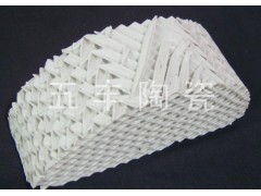 陶瓷波紋填料一種新型高效填料。它是由許多具有相同幾何形狀的填料單元體組成,由相互平行疊加的波紋片組成的圓柱狀單元稱之波紋板填料。陶瓷波紋規整填料的選材為:主要成分優質鋁粉、粘土、石英、長石,按科學配比并配以部份稀有元素,通過烘干、篩選、球磨成瓷泥,加上幾道成型工藝成型、成坯、烘干、煅燒精制而成,它含有鋁、硅等多種稀有元素,陶瓷波紋規整填料具有壁薄、質輕、機械強度大、使用周期長、不易碎、易組裝、使用方便、使用效率高、壓降低、處理量大、持液量小、放大效應不明顯、操作彈性大等有優點,深受用戶歡迎。