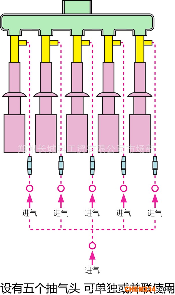 ●SHB-B95循環水式多用真空泵有五抽頭,可單獨或并聯使用。用五通管(選配)并聯后抽氣量大,可滿足大型旋轉蒸發儀或反應釜的需要。