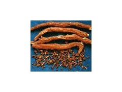 【鑒別】 本品橫切面:木栓層為6 ~8 列木栓細胞。皮層狹窄,外側(cè)有2 ~4列厚角細胞。韌皮部較寬,外側(cè)有裂隙,纖維成束散在,纖維壁厚,微木化;韌皮射線外側(cè)常彎曲。形成層成環(huán)。木質(zhì)部導管單個散在或2~3個相聚,其周圍有木纖維。纖維束周圍的薄壁細胞含草酸鈣方晶。粉末黃棕色。纖維成束,直徑5 ~22μm ,壁厚,微木化,周圍細胞含草酸鈣方晶,形成晶纖維,含晶細胞壁不均勻增厚。草酸鈣方晶直徑7~14μm,長約至22μm。 具緣紋孔導管直徑至145μm。淀粉粒單粒類圓形或卵圓形,直徑2~19μm;復粒由2~8分粒組成。