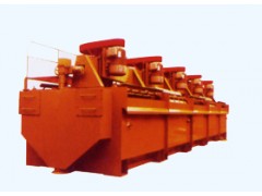 浮選機主要用于選別銅、鋅、鉛、鎳、金等有色金屬,也可以用于黑色金屬和非金屬的粗選和精選。 煤泥和藥劑充分混合后給入浮選機的第一室的槽底下,葉輪旋轉后,在輪腔中形成負壓,使得槽底下和槽中的礦漿分別由葉輪的下吸口和上吸口進入混合區,也使得空氣沿導氣套筒進入混合區,礦漿、空氣和藥劑在這里混合。在葉輪離心力的作用下,混合后的礦漿進入礦化區,空氣形成氣泡并被粉碎,與煤粒充分接觸,形成礦化氣泡,在定子和紊流板的作用下,均勻地分布于槽體截面,并且向上移動進入分離區,富集形成泡沫層,由刮泡機構排出,形成精煤泡沫。槽底上面未被礦化的煤粒會通過循環孔和上吸口再一次混合、礦化和分離。槽底下未被葉輪吸入的部分礦漿,通過埋沒在礦漿中的中礦箱進入第二室的槽底下,完成第一室的全部過程后,進入第三室,浮選機如此周而復始,礦漿通過最后一室后進入尾礦箱排出最終尾礦。