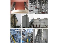 大傾角輸送機是在平行橡膠輸送帶兩側,增加不同高度的可彎曲伸縮的橡膠波形立式“裙邊”,帶體中間具有一定強度和彈性的“T”形或“C”形橡膠橫隔板。使物料在一個匣形的容器中進行輸送,輸送傾角小于40°時,使用“T”橫隔板,傾角大于40°時,使用“C”型橫隔板,傾角最大可達90°。