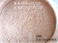 莊彩13823334561銅金粉是一種浮型片狀顏料,紫銅粉,青金粉,紅金粉,黃金粉,由一定比例的銅、鋅和鋁合金,經熔煉、煉磨、分級而成。銅金粉其顆粒很粗,金屬感越強,越閃爍,但遮蓋力較差,反之,顆粒很小,其金屬感越弱,色澤也越柔和,其遮蓋力也越好。銅金粉色澤純正亮麗、金屬感強烈,根據不同的應用領域和所需達到的金屬效果,可通過選擇不同顆粒直徑和色相來實現。