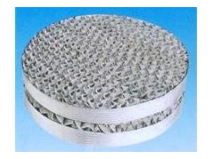 該填料采用表面有溝紋的孔板制成,保持了金屬絲網(wǎng)波紋填料結(jié)構特點,增加了液體的均布和填料潤濕性能,提高了傳質(zhì)效率。每盤單元高度為50-200mm,填徑超過1.5m,填料制成分塊形式。