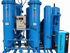 原料空氣經(jīng)空氣壓縮機(jī)增壓至0.8MPa,經(jīng)過壓縮空氣凈化系統(tǒng)除去大量油、水、塵等其它雜質(zhì),進(jìn)入吸附器。凈化后的干燥純凈的原料空氣,經(jīng)緩沖過濾器,進(jìn)入吸附器底部,氣流經(jīng)分布器擴(kuò)散后,進(jìn)入裝填碳分子篩的吸附器,進(jìn)行變壓吸附,實(shí)行氧氮分離。氮在氣相中得到富集,作為產(chǎn)品從上端出口再進(jìn)入氮?dú)饩彌_罐、調(diào)壓閥、流量計(jì)輸出,廢氣在消音器端排出。