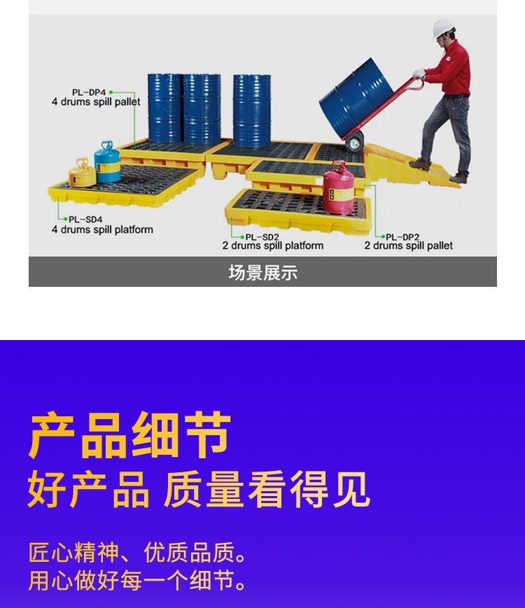目前很多化工廠、廢物處理廠,實驗室都存放有油桶、化學品桶或一些化學品容器,這些東西,都可能因儲存、使用、運輸過程中出現泄漏、飛濺等情況。出現這種情況首先會污染工作環境,影響清潔生產;還有可能引發摔跤跌倒等安全事故;泄漏物還有可能流入下水道或雨水口,污染水體和土壤,對環境造成惡劣影響,嚴重的危險化學品泄漏甚至會危及到人們的生命健康。這些安全隱患,都應該引起我們的足夠重視。為了避免發生以上情況,或在發生后及時處理,降低風險,就要用到防滲漏托盤了。