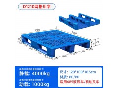 1210川字塑料托盤的靜載為4T,動載為1.5T或1T,貨架承載為0.8T;如果需要上貨架使用,那么需要單獨添加鋼管,1210川字托盤可內置8根鋼管,用于增強動載及適配于貨架使用。