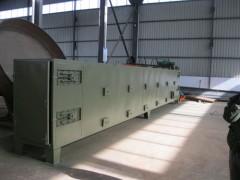 網帶烘干機將所要處理的物料通過適當的鋪料機構,如星型布料器、擺動帶、粉碎機或造粒機,分布在輸送帶上,輸送帶通過一個或幾個加熱單元組成的通道,每個加熱單元均配有空氣加熱和循環系統,每一個通道有一個或幾個排濕系統,在輸送帶通過時,熱空氣從上往下或從下往上通過輸送帶上的物料,從而使物料能均勻干燥。