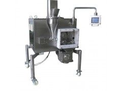 干法造粒機工作原理:料倉內的物料,通過攪拌器的攪動,排除空氣的同時,穩定的為水平送料器供料。物料進入水平送料器后,在旋轉螺桿的帶動下,使物料在前移過程中逐漸脫氣,并將提高密度后的物料強制送入壓片機。壓片機將水平送料器輸送的高密度物料,通過一對液壓油缸(壓力可調)推動的壓輥,把物料軋制成2---4mm的薄片,并再次完成脫氣工作。軋好的薄片經過剪切式破碎機的刀齒,切成易于整粒的碎片后落入整粒機。碎片在整粒刀的擠壓下,被強制擠出篩板。擠出的顆粒經篩分后,即可獲得客戶所需粒度的產品。至此,完成了制粒的全部過程。