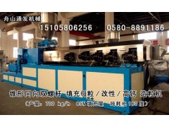 TF-500型號“新型密煉式 填充母粒/ 改性母粒 /色母雙螺桿造粒機”(螺桿直徑65/130mm;長徑比48:1;螺桿有效長度3150mm;主電機功率75KW;產量700kg/h;噸耗電150度)