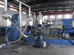 密煉機的團狀料經提升機,雙腕喂料機,擠出機,切粒,冷卻,篩分,終端料倉全部自動化,流水作業。物料密煉后經過雙腕喂料機強制進入橡膠母粒造粒機,橡膠母粒造粒機的螺桿芯部通水,螺桿全稱分散,無過分摩擦熱。分散效果優異,主機電流小,節能環保。橡膠母粒造粒機精確的溫度控制,確保了低溫造粒的工藝,特殊的隔離劑回收系統,有效解決了生產中粉塵問題,而且加的隔離劑不會造成太大的浪費。橡膠母粒造粒機臺還可用于PVC,低煙無鹵電纜料,內外屏蔽電纜料,氯化聚乙烯,功能母粒,色母粒,熱收縮料,PP+炭黑低煙無鹵系列及各種橡膠母粒的生產加工。
