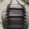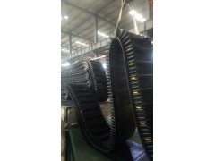 定做大傾角輸送機皮帶是由基帶、擋邊、橫隔板3部分組成的。擋邊主要起防止物料側滑撒落的作用。同時為了便于繞過滾筒,設計者特意將檔邊設計成波紋狀。橫隔板的作用是承托物料,考慮到大傾角輸送的功能,設計者還特意采用T型TC型的橫隔板。而且檔邊和橫隔板是用二次硫化的方法與基帶連接的,因此具有很高的連接強度。
