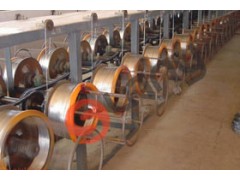 技術(shù)標(biāo)準(zhǔn)、產(chǎn)品規(guī)格GB/T343-94一般用途低碳鋼絲,抗拉強度295-540N/mm2,伸長率%(標(biāo)距100mm)≥12,鋼絲鍍鋅層鋅層重量約定5-25g/m2。(一)8#~16#鍍鋅鐵絲,成品捆重50公斤8#(φ4.00m/m)10#(φ3.50m/m)12#(φ2.80m/m)14#(2.20m/m)16#(φ1.60m/m)(二)18#~22#鍍鋅鐵絲,成品捆重25公斤18#(φ1.20m/m) 20#(φ0.90m/m) 22#(φ0.70m/m)二、生產(chǎn)流程(一)8#~16#鍍鋅鐵絲:φ6.50m/m線材(牌號Q195)→干式拉絲機、LT-10/550型水箱拉絲機拉拔→退火→鹽酸洗→水洗(二次)→防銹液→508型電鍍鋅生產(chǎn)線鍍鋅{鐵絲上φ560型旋轉(zhuǎn)立式放線架放線→校直→鹽酸洗→清水洗→電鍍(配鍍液)→冷水洗→熱水浴→烘干→508型臥式電鍍鋅收線機收線→下線過磅→檢驗→扎捆→打包→進庫}。(二)18#~22#鍍鋅鐵絲:φ6.50m/m線材(牌號Q195、M8)→干式拉絲機、LT-10/550型水箱拉絲機拉拔到φ2.50m/m、φ2.20m/m→退火→LT-12/350型水箱拉絲機拉拔上φ280m/m工字輪→二次退火→上356型電鍍鋅生產(chǎn)線鍍鋅{線盤上工字輪臥式放線架放線→鹽酸洗→清水洗→電鍍(配鍍液)→冷水洗→熱水浴→烘干→356型臥式電鍍鋅收線機收線→下線→檢驗→過磅→扎捆→打包→進庫}。聯(lián)昌機械廠專業(yè)制造新型8#~22#鍍鋅鐵絲(鉛絲)成套生產(chǎn)線,提供拉絲、退火、鍍鋅工藝技術(shù)服務(wù)。不斷地創(chuàng)新設(shè)備工藝,提供具有競爭優(yōu)勢,環(huán)保型,產(chǎn)量高、成本低、操作方便的優(yōu)質(zhì)鍍鋅設(shè)備。硫酸鹽鍍鋅光亮劑工藝配方完全適用于該設(shè)備,生產(chǎn)的鍍鋅鐵絲表面光澤度好、鋅層均勻、附著力強,耐腐蝕力持久,深得國內(nèi)外用戶好評和信賴。新型鍍鋅設(shè)備達出口標(biāo)準(zhǔn),質(zhì)優(yōu)無易損件。同老型設(shè)備相比,新設(shè)備使用壽命達6倍左右,原材料成本3倍左右,薄利多銷價格是2.5倍左右。新型、老型設(shè)備對比一、塑料槽部分(一)新型設(shè)備:聚丙烯PP板,厚15m/m,原料價16元/公斤,強度高、耐高溫,符合出口標(biāo)準(zhǔn)。寬度尺寸定型700m/m或500m/m二種,陰極電流密度滿足工藝要求。容易控制調(diào)整三度(濃度B'e、酸度PH值、溫度℃),配方原料節(jié)省。(二)老型設(shè)備:聚氯乙烯PVC板,厚12m/m,原料價6元/公斤,不耐高溫,易損壞。寬度900m/m或1000m/m二種,陰極電流密度難滿足工藝要求,三度難控制,配方原料浪費。二、壓絲輥部分(一)新型設(shè)備:壓絲輥采用瓷葫蘆,高壓電瓷廠定制,外徑φ180m/m,保證鐵絲在鍍糟鍍液中深度、同心度好,很耐磨,表面光潔度好,鍍鋅層表面不擦傷。(二)老型設(shè)備:壓絲輥采用石輥或硬塑料輥,外徑偏小,同心度差,表面粗糙,鍍鋅層表面擦傷,影響產(chǎn)品質(zhì)量。三、導(dǎo)電系統(tǒng)(一)新型設(shè)備:①主導(dǎo)電定型80?m/m,100?m/m二種規(guī)格銅排;②陽極鍍槽中鈦排,價格為320元/公斤左右,不要調(diào)換;③陰極中間塑料槽雙鐵滾銅瓦、銅排組合,陰極鐵滾跟鐵絲轉(zhuǎn)動,鍍鋅層不擦傷。(二)老型設(shè)備:①主導(dǎo)電鋁排,鋁排易氧化,造成導(dǎo)電不良;②陽極鍍槽中鉛排,價格為16元/公斤左右,使用1年左右消耗掉,要裝新鉛排,鉛有害元素會造成鍍鋅層含鉛量超標(biāo),產(chǎn)品出口不合格;③無中間塑料槽,陰極靠鐵絲在銅排上定位圈磨擦,接觸面少,并會造成鐵絲鍍鋅層擦傷。四、整流器新型設(shè)備三次整流,直流電質(zhì)量好,容量保護系數(shù)高,配套調(diào)壓器性能可靠,完全能達到工藝需要。五、熱水池烘箱(一)新型設(shè)備:環(huán)保型,全部用電加熱,溫度溫控儀自動控制。(二)老型設(shè)備:煤加熱,操作不方便,有黑煙對環(huán)境造成污染。六、收線機部分(一)新型設(shè)備:①收線機大小頭每只卷筒有自動打滑裝置,保證鐵絲不縮絲,保護鍍槽系統(tǒng)設(shè)備,防止工傷事故;②全封閉防止鐵絲卷到卷筒軸上,符合機械制造標(biāo)準(zhǔn);③鏈輪2寸20牙,45#鋼鍛件使用壽命長;④下線計量方便,可用磅稱改裝成小車形式,下絲、過磅、計量一次完成。粗絲8#~16#配電動扎絲機,能扎緊,包裝符合GB/T343-94標(biāo)準(zhǔn),減輕工人勞動強度。(二)老型設(shè)備:①收線機無大小頭,是造成烘箱高的原因,操作不方便。②不封閉,不符合機械制造標(biāo)準(zhǔn);③鏈輪鏈條偏小,使用壽命短;④下絲打包勞動強度大。七、新型設(shè)備增添設(shè)備(一)校直器:防止鐵絲在鍍槽中打攪。(二)回絲架:經(jīng)常塞好回絲①擋住酸液;②擋住鍍液,節(jié)省生產(chǎn)成本,減少鍍鋅絲表面殘留鍍液量,冷水池水中含鋅量相應(yīng)減少,能達到排放標(biāo)準(zhǔn)。八、生產(chǎn)18#~22#鍍鋅鐵絲,采用工字輪放線形式,是最理想的自動放線形式,無亂絲現(xiàn)象出現(xiàn),保證生產(chǎn)線正常生產(chǎn),操作十分方便。
