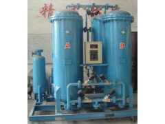 PSA(pressure swing adsotption)技術方法應用中小型氮氣制造設備。工作原理:根據變壓吸附原理,采用高品質碳分子篩作為吸附劑。在一定壓力下由于動力學效應,氧在碳分子篩孔中的擴散速率遠大于氮,在吸附未達到平衡時,氧被碳分子篩大量吸附,氮分子在氣相中被富集,達到氧氮分離。由于碳分子篩對氧的吸附容量隨壓力的不同兩者有明顯差異,降低壓力,既可解吸碳分子篩吸附的氧分子,使碳分子篩再生,得以重復循環使用。本公司產品采用雙塔結構,一個塔在吸附產氮,一塔解吸再生,通過PLC智能程序控制器控制氣動角座閥的啟閉,使兩塔循環交替,連續產出氮氣。