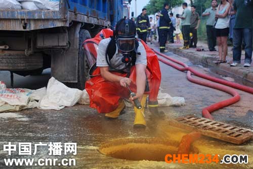 由于槽罐泄漏的廢酸流入了下水道,消防部門立即對下風風向的下水道進行了堵截,因為情況不明,酸霧過濃,消防隊員無法進入泄漏區。下午16時40分,重型防化服運到,一名消防員著裝進入泄漏區勘察。隨后,現場指揮部制定處置方案,由業主趕制簡易堵漏工具,將槽罐下方的出口堵塞。堵漏工具很簡陋,只不過在一根長鋼筋的一端扎上毛巾、薄膜,但效果卻較好。下午16時50分,槽罐的泄漏點成功堵住。17時左右,現場指揮部調來一車氫氧化鈉,投入下水道后用水中和,防止廢酸污染地下水源。