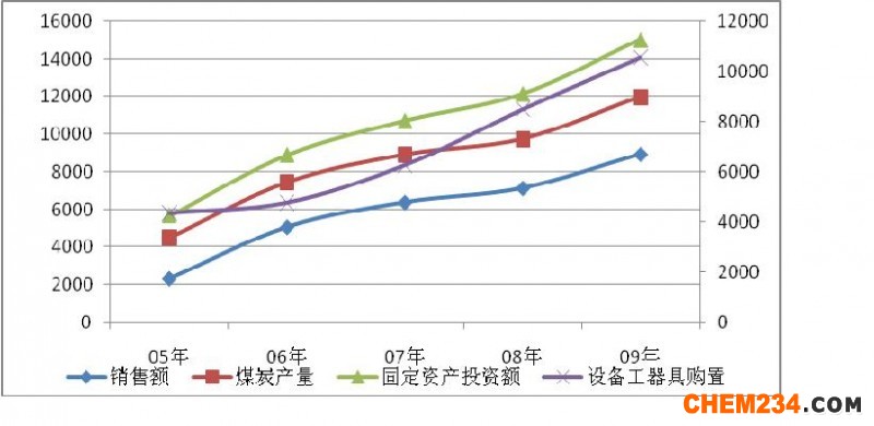 煤炭產量增加以及固定資產投資增加,煤炭相關設備購買費用增加將會刺激磁力應用設備的需求。2005-2009年,磁力應用設備行業銷售狀況與煤炭行業產量、固定資產投資與設備購置之間的變動情況如下圖: