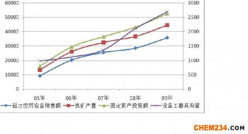 鐵礦石產量增加,固定資產投資增加,相關設備購買費用增加將會刺激磁力應用設備的需求。2005-2009年,磁力應用設備行業銷售狀況與鋼鐵行業需求變動情況如下圖: