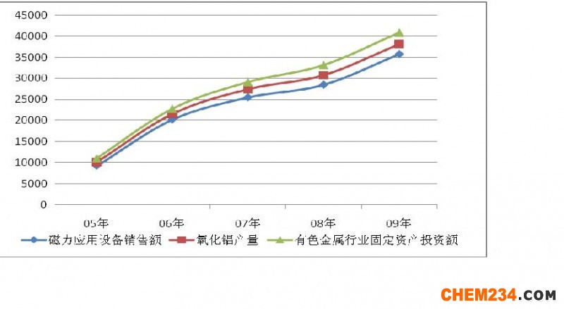有色金屬行業產量增加將會刺激磁力應用設備的需求。2005-2009年,磁力應用設備行業銷售狀況與有色金屬行業需求變動情況如下圖: