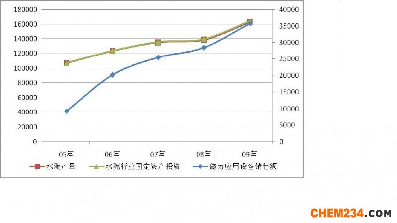 水泥產量增加將會刺激磁力應用設備的需求。2005-2009年磁力應用設備銷售額與水泥行業產量、固定資產投資額變動情況如下圖: