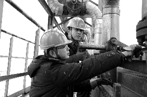 中化化工網訊 11月26日,吉林地區再次出現強降雪。,強化防凍管理,加大監控力度,尤其針對重點設備、保溫伴熱設備及管線進行特別“關照”,實行連續巡檢、特保特護,確保工作到位、人員到位、措施到位,為冬季裝置安全穩定運行提供了保障。圖為該公司煉油廠延遲焦化車間員工正冒雪檢查裝置空冷器運行情況。 (何天林 攝)