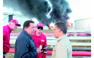 (中華化工網訊)當地時間8月25日,委內瑞拉法爾孔州阿穆艾煉油廠發生大規模爆炸并引發火災,導致至少41人死亡,超過80人受傷。該煉油廠是委內瑞拉最大的煉油廠,每天能加工原油64.5萬桶。圖為26日,委內瑞拉總統查韋斯(前排左)到現場視察,要求就爆炸原因展開深入調查,并采取相應行動。 (CFP 供圖)