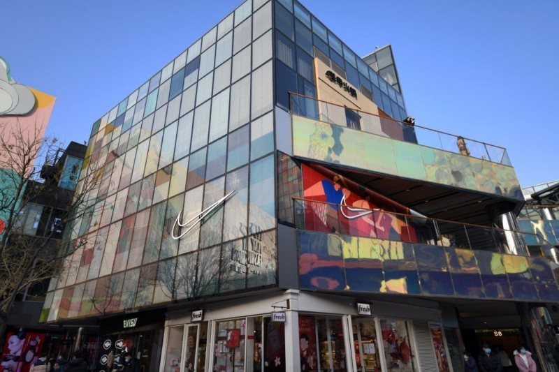 2021年初,Nike Live鄰里體驗店中國首店在上海興業太古匯開幕,隨后第二家店登陸北京三里屯太古里,打出了“本地化、社群化和數字化”的新零售概念。兩家門店因地制宜,設計風格并不完全一樣,但是都采用了標志性的大幅運動主題彩色插畫,一下子就將其與其他Nike門店區分開來。門店的超大發光Logo使用羅姆集團的寶克力®板材,采用并不多見的整幅厚板鏤空做法,成為這一獨特設計風格的點睛之筆。