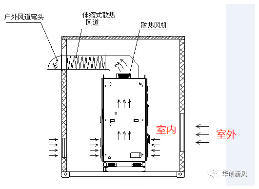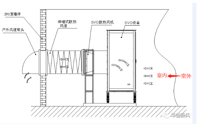 目前風(fēng)電場上的SVG裝置,基本上都是安放在土建房或者集裝箱房里,不管是土建房還是集裝箱房,我們都統(tǒng)稱叫“SVG室”。SVG大部分都是采取強迫風(fēng)冷散熱,也就是SVG機柜上安裝了若干個離心風(fēng)機,通過風(fēng)管風(fēng)道將熱風(fēng)往室外進行排風(fēng),在風(fēng)機的強排風(fēng)下,SVG室內(nèi)將會產(chǎn)生很大的負(fù)壓差,室外的冷空氣將通過進風(fēng)口進入到室內(nèi),再從室內(nèi)進入到SVG機柜內(nèi)部,然后被風(fēng)機從機柜內(nèi)部抽到室外,形成一個循環(huán)的強制風(fēng)冷散熱。具體工作原理如下圖表示: