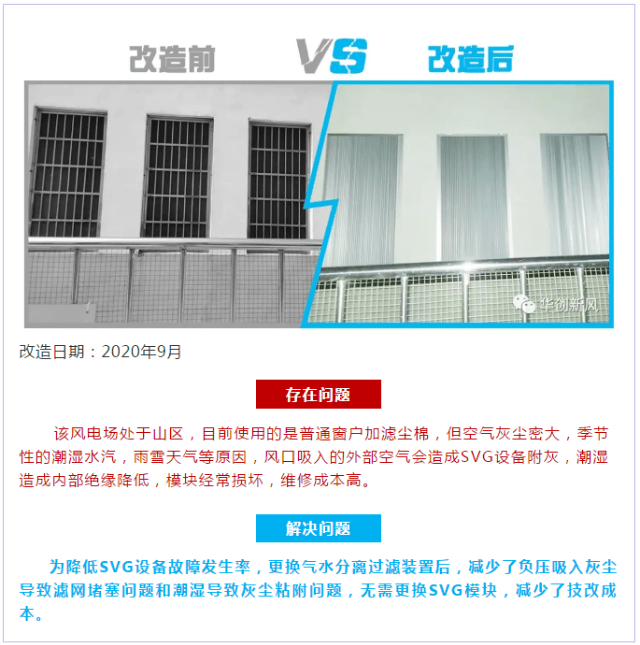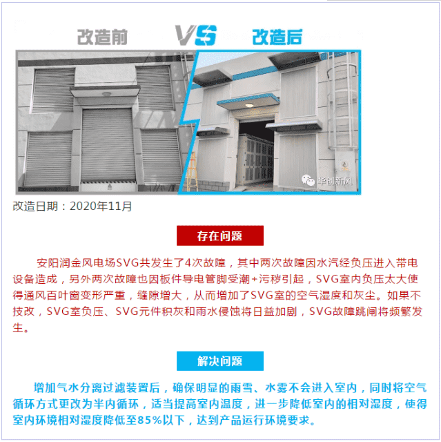 這些年,很多風(fēng)電場業(yè)主為了解決灰塵及潮氣入侵帶來的SVG頻繁故障問題,也嘗試了很多的解決方案,比如在SVG室內(nèi)增加若干臺工業(yè)除濕機,對SVG室進行除濕處理,但效果并不理想,因為SVG室不是密閉的,不斷的有冷風(fēng)進去,有熱風(fēng)出來,室外的空氣進入到SVG室之后,沒經(jīng)除濕機就直接進入到SVG機柜內(nèi)部了,除濕效果非常不理想。也有業(yè)主將進風(fēng)口的百葉窗進行封閉處理,即將SVG室進行密封處理,然后投放幾臺大功率的工業(yè)空調(diào)對SVG室進行制冷散熱冷卻,這種改造方案是可行,但是投入成本非常高昂,單單購買工業(yè)空調(diào)就要大大幾十萬,工業(yè)空調(diào)每年所產(chǎn)生的電費又要好幾十萬,這個代價是非常之大的。除了這兩種方案,也有業(yè)主將SVG由強制風(fēng)冷散熱改造成空-水冷散熱或者水冷散熱,但是這個改造工程成本也是非常高昂的,而且這個改造還不是電站業(yè)主單方面可以自行改造的,必須得找SVG廠商同意整改才行,牽一動全身,得結(jié)合SVG的發(fā)熱量及控制單元進行綜合升級改造才行,改造費用高昂,工期還特別長。