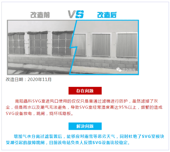 正是由于SVG室內(nèi)和室外形成強大的負(fù)壓差,室外的空氣不斷的被吸入到室內(nèi),再從室內(nèi)進入到機柜內(nèi)部,而灰塵和潮氣就是隨著空氣一起被吸入到SVG室內(nèi)進而進入到SVG機柜內(nèi),所以要解決灰塵和潮氣入侵到SVG室內(nèi),就得從SVG室墻體上開設(shè)的進風(fēng)口做文章,要做到冷空氣能進去,灰塵和潮氣進不去,這才是解決SVG免受灰塵和潮氣入侵的根源。