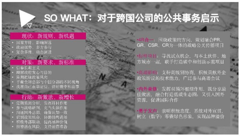 “跨國(guó)公司在中國(guó)的經(jīng)營(yíng)要信奉長(zhǎng)期主義,理解碳減排的問(wèn)題長(zhǎng)期性和復(fù)雜性,關(guān)注中國(guó)政府的政治雄心如何在政策領(lǐng)域得到貫徹。外資企業(yè)應(yīng)在深刻理解政府意圖之外,重點(diǎn)關(guān)注不同產(chǎn)業(yè)和地區(qū)的法規(guī)制定及推進(jìn)情況,積極參與并研究政策在不同階段的重點(diǎn)以便更好地應(yīng)對(duì)。此外,一定要平衡全球總部的考慮和中國(guó)分部的實(shí)情。業(yè)務(wù)負(fù)責(zé)人找準(zhǔn)公司的在華定位,講好碳中和故事也是重中之重。”在深入分析了中央、行業(yè)、地方與城鎮(zhèn)化層面碳中和政策的政策框架、主要措施和利益相關(guān)方后,資深政府事務(wù)及公共關(guān)系專家姜曉峰先生為跨國(guó)公司在業(yè)務(wù)與公共關(guān)系層面如何應(yīng)時(shí)而動(dòng)、順勢(shì)而為給出了自己的思考與建議。