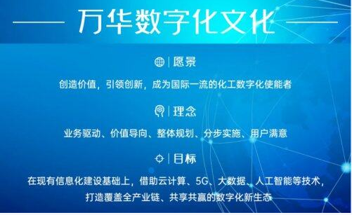 通過“智慧萬華2025”戰(zhàn)略 引領(lǐng)及落地執(zhí)行,用5年時間,實(shí)現(xiàn)標(biāo)準(zhǔn)化向智能化轉(zhuǎn)變,將萬華化學(xué)建設(shè)成為以智能制造、全球一體化管控、生態(tài)圈高效協(xié)作為主要特征的世界一流數(shù)字化企業(yè),形成萬華化學(xué)專屬數(shù)字化競爭優(yōu)勢,打造安全、高效、體驗(yàn)友好的數(shù)字智慧萬華。