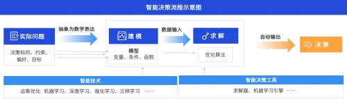智能決策,是指組織或個?綜合利?多種智能技術和?具,基于既定?標,對相關數據進?建模、分析并得到決策的過程。該過程綜合約束條件、策略、偏好、不確定性等因素,可?動實現最優決策,以?于解決新增?時代?益復雜的?產、?活問題。