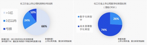 國內化工企業大多數是一些附加值低、產能落后傳統型企業,數字化基礎薄弱,隨著市場供需兩側不確定因素增加,原先粗獷式的經營方式失靈,大多化工企業缺乏抵御市場風險的韌性,經營壓力大。據公開數據顯示,截至2021年前三季度,A股化學制品行業上市公司273家,其中24%的企業凈利潤不到1億元人民幣,10%的企業處于虧損狀態,行業整體利潤微薄甚至虧損,化工企業亟待轉型。