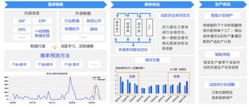 國內一家典型的以磷化工為主體的農化企業,國內擁有7家子公司、18個銷區,覆蓋30個省份、1600個經銷商、2萬個電商、250萬噸化肥、100+品種,通過智能決策技術實現數字化轉型第三級跳,轉型效果顯著,其綜合能耗降低10%,庫存積壓率降低20%,倉儲成本節約超6000萬,有效產能利用率實現20%的提升。同時,這種供給側平衡為企業生產、倉儲、運輸成本帶來了顯著降低,進而實現了碳減排的綠色發展目標。