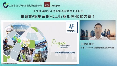 沙索(Sasol)亞洲戰(zhàn)略業(yè)務(wù)拓展總監(jiān)王睿嘉博士分享了沙索的化工行業(yè)低碳轉(zhuǎn)型戰(zhàn)略、思考及實(shí)踐。沙索集團(tuán)是一家綜合性的化工、能源一體化的跨國(guó)公司,總部位于南非約翰內(nèi)斯堡,全球有30000多名員工,中國(guó)總部位于南京。在低碳轉(zhuǎn)型戰(zhàn)略上,沙索承諾將在2030年減少30%的溫室氣體排放,在2050年實(shí)現(xiàn)凈零排放目標(biāo)。除了不再投資任何新的煤炭?jī)?chǔ)備,并以天然氣作為轉(zhuǎn)型過(guò)程的主要替代原料之外,沙索還將通過(guò)大規(guī)模使用可再生能源、費(fèi)托合成的可持續(xù)轉(zhuǎn)型、投資可持續(xù)、循環(huán)經(jīng)濟(jì)和特殊化學(xué)品,以及在南非領(lǐng)導(dǎo)綠氫產(chǎn)業(yè)等方式,用創(chuàng)新和合作來(lái)創(chuàng)造一個(gè)更加美好的世界。