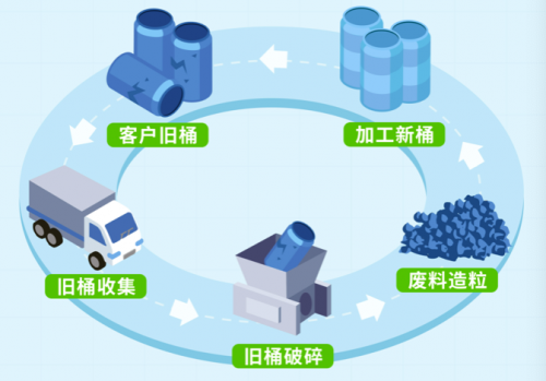 目前,廢塑料包裝桶的循環利用已經在華北、華東和華南等區域成功實踐,在提高回料桶產品質量穩定性同時還具有顯著的經濟效益,這極大的解決了下游客戶處理廢棄包裝物的痛點,為治理塑料污染提供了借鑒。