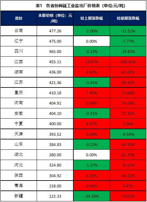 分價格區間來看,本期兩堿工業鹽單價在400-500元/噸之間的地區有10個,分別是云南、遼寧、四川、江西、湖南、江蘇、重慶、河南、安徽、寧夏;兩堿工業鹽單價在400元/噸以下的地區有7個,分別是天津、山東、湖北、河北、陜西、青海、新疆。