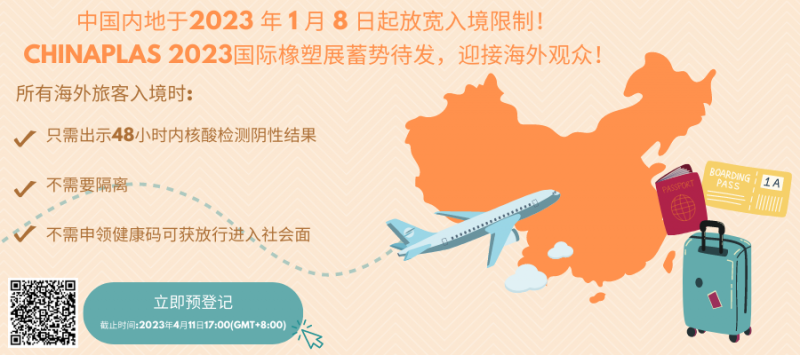 中國內(nèi)地實施入境限制接近3年,已于2023 年1月8日放寬入境限制。來華人員只需入境時出示48小時內(nèi)核酸檢測陰性結(jié)果,不再需要申請健康碼和集中隔離,可放行進(jìn)入社會面。中國將完善海外旅客的簽證安排及逐步恢復(fù)國際航班。將于4月份在深圳舉辦的“CHINAPLAS 2023 國際橡塑展”蓄勢待發(fā),做好了準(zhǔn)備迎接闊別3年的海外觀眾,火力全開推出具創(chuàng)新性的橡塑解決方案及行業(yè)信息。