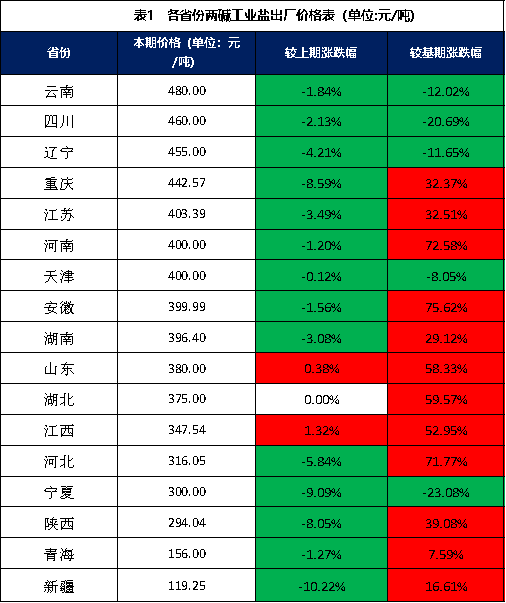 分價格區(qū)間來看,本期兩堿工業(yè)鹽單價在400-500元/噸之間的地區(qū)有7個,分別是云南、四川、遼寧、重慶、江蘇、河南、天津;兩堿工業(yè)鹽單價在400元/噸以下的地區(qū)有10個,分別是安徽、湖南、山東、湖北、江西、河北、寧夏、陜西、青海、新疆。