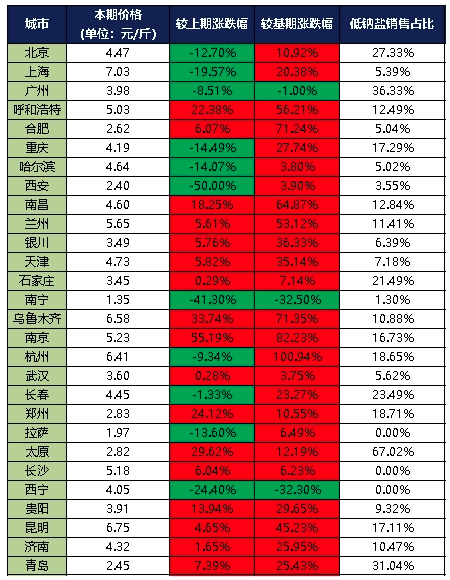 分價格區(qū)間來看,本期超市食用鹽銷售單價在5元/斤以上的城市有8個,分別是上海、呼和浩特、蘭州、烏魯木齊、南京、杭州、長沙、昆明;超市食用鹽銷售單價在4-5元/斤之間的城市有8個,分別是北京、重慶、哈爾濱、南昌、天津、長春、西寧、濟南;超市食用鹽銷售單價在3-4元/斤之間的城市有5個,分別是廣州、銀川、石家莊、武漢、貴陽;超市食用鹽銷售單價在3元/斤以下的城市有7個,分別是合肥、西安、南寧、鄭州、拉薩、太原、青島。
